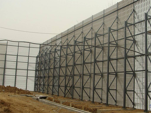 屏体尺寸:500*2000mm,采用1.2mm厚的镀锌板,厚度为100mm,上部带折角,冷却塔声屏障立柱为125 H型钢,高5.5m,表面处理采用热镀锌+喷塑,声屏障稳固方面,加增斜撑。